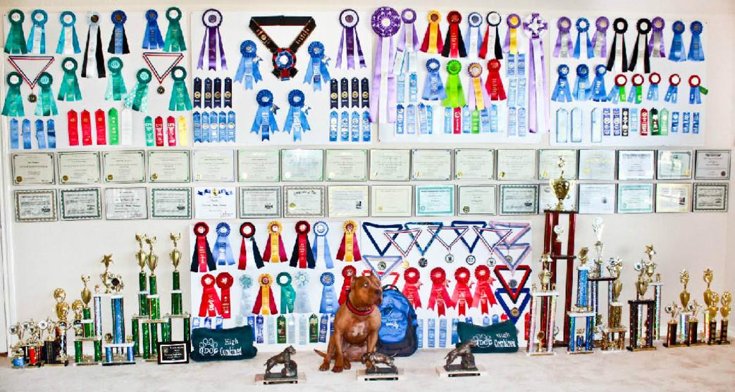 "Pun" is arguably one of the most well balanced and versatile working APBTs in the country, Punisher is equally as comfortable and confident in a conformation ring as he in on an agility field or in a protection tournament. Very biddable and eager to please with a solid, even temperament and lots of drive, this dog sets to a task and sticks to it until it is completed. The word impressive hardly describes Pun's list of accomplishments. Pun is the 2011 Iron Dog Pentathlon and Novice Protection National Champion, He also took 3rd Place at ADBA Nationals and 2nd Place at Iron Dog Nationals In His Weight Pull Class in 2011. He also competes in dock diving events in numerous registries, drafting, and agility. On his way to Super Dog, Pun placed first with competition at least once in the five competitive areas. He also achieved multiple Most Weight Pulled and Most Weight Pulled Per Pound designations. He is the 2012 ABKC National Weight Pull Champion in his class and 76 lbs and over Body Pound Champion. Punisher has placed at Weight Pull Nationals in the following organazations: UPF, APA, ADBA, Iron Dog, UCA, and ABKC.
